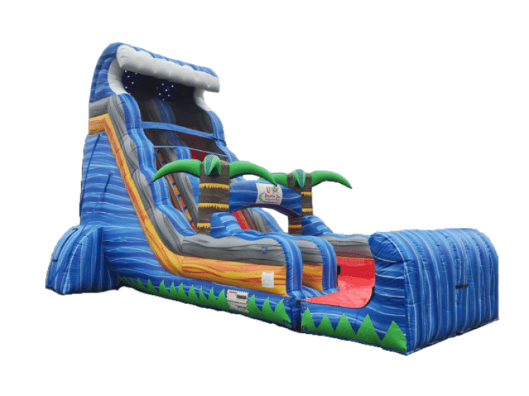 Climb your way up to the top of the 22ft. Tropical Tsunami Dry Slide, where the steep angle of the slide will have your adrenaline pumping! Get ready to take the ride of your life, sliding down the steep, fast slope and zooming down to the cushioned bottom below. This inflatable dry slide (no water) rental is perfect for any event, featuring bright and vivid colors that are sure to be the centerpiece for your party. Plus, with "no jump" safety netting at the top of the slide platform and easy-grip handles to make climbing a breeze. This huge slide is sure to be a thrilling experience for both kids and adults alike. It's easy for parents and spectators to keep an eye on the action because all your guests enter and exit in front of the slide. Reserve today and make your next event one to remember with the 22ft. Tropical Tsunami!